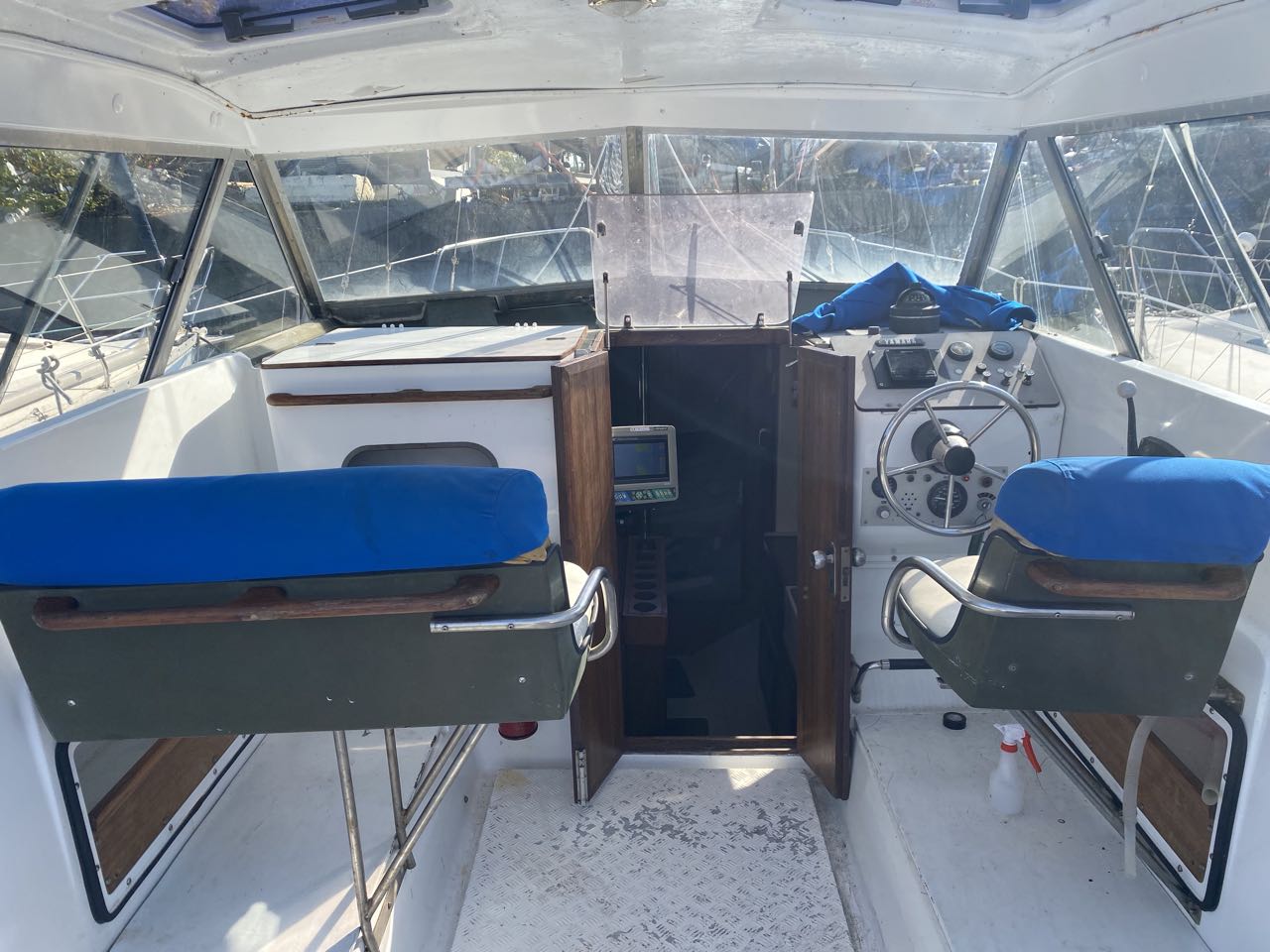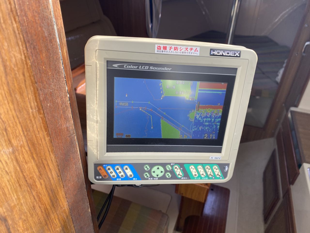 装備品:HONDEX GPS魚探、Raymarine オートパイロット、ストロングトラック、電動マリントイレ、コクピットオーニング、スイミングプラットフォーム